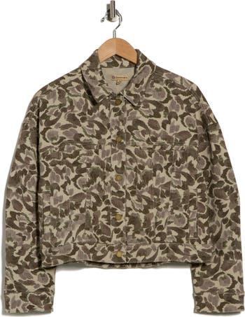An allover camo print in muted tones amplifies the style points of a trendy jacket fronted by chest pockets and brassy buttons for a well-loved and lived-in appeal.