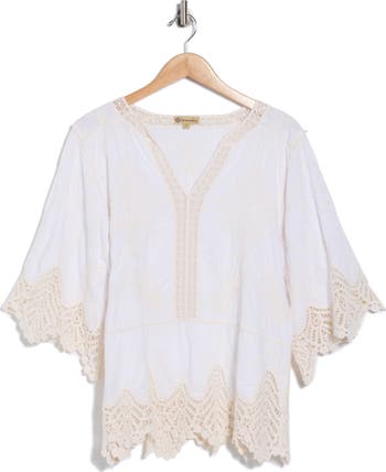 Sway in free-spirited style in this all-cotton top framed with crochet-trimmed sleeves and a peplum hem.