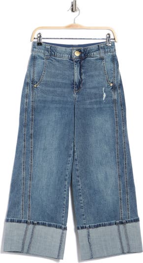 Cuffed hems, fading and whiskering enhance the casual-cool styling of these high-waisted jeans cut from stretch-kissed denim with a wide leg.