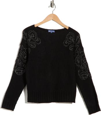 Floral embroidery brings instant charm to this soft, woolly pullover sweater framed by an elegant boat neck and slouchy dropped shoulders.