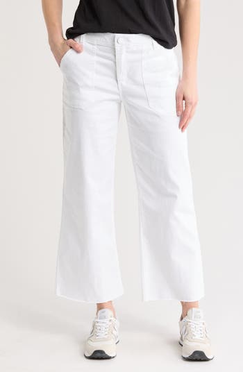 Trendy details like utility pockets and raw hems update the style of these cropped flare jeans made from low-stretch denim.
