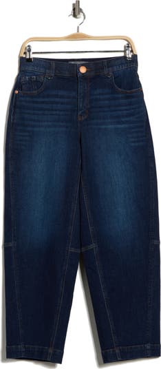 Perfectly washed, stretch-kissed denim shapes these on-trend jeans that curve at the knees and taper to cropped hems for a barrel silhouette.
