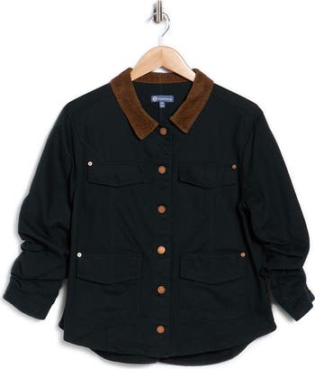 A corduroy collar frames this timelessly cool shirt-jacket framed by ruched three-quarter sleeves and roomy utility pockets.