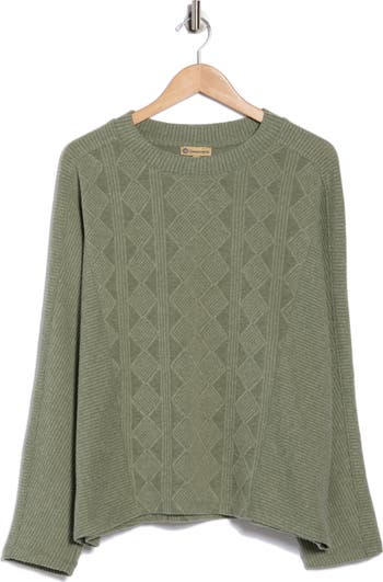Geometric and ribbed stitches highlight this slouchy pullover sweater knit from soft yarns for an ultracozy feel.
