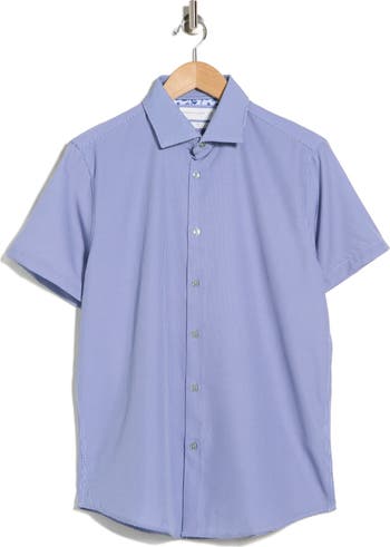 A vibrant print enriches a stylish button-up cut from stretchy, breathable fabric for a flexible fit.