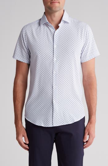 A geometric print adds dapper distinction to this not-so-basic button-up shirt cut from comfortable tech fabric.