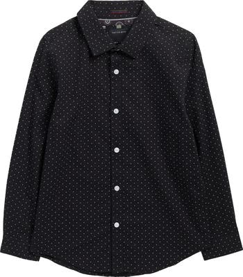 Your kiddo will look sharp and sophisticated in a button-up shirt patterned in tiny, high-contrast dots.