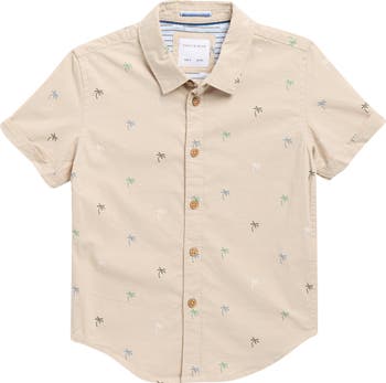 An allover palm print brings sun-ready appeal to this short-sleeve button-up shirt cut from cotton-forward fabric.