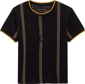Tipping and a striped print lend bold contrast to a crewneck T-shirt cut entirely from cotton for a comfy fit on classroom days, weekend outings and everything in between.