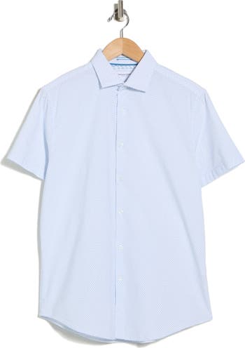 A ditsy geometric pattern adds style intrigue to a button-down shirt crafted from lightweight fabric to keep your look cool and casual.