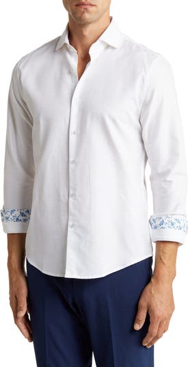 A solid hue creates a versatile appearance to a lightweight and breathable dress shirt crafted from blended cotton.
