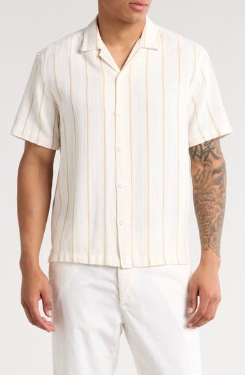 Neutral stripes race down a short-sleeve button-up shirt constructed from a breathable cotton blend for maximum comfort.