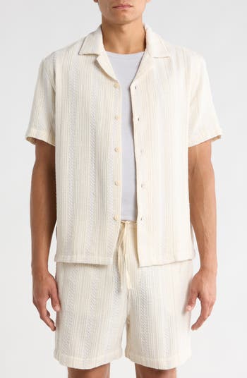 A relaxed silhouette creates an easygoing vibe in a textured button-up shirt framed with short sleeves and a notched collar.