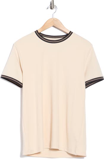 Striped trim bring bold contrast to this crewneck T-shirt knit from a cozy cotton blend.