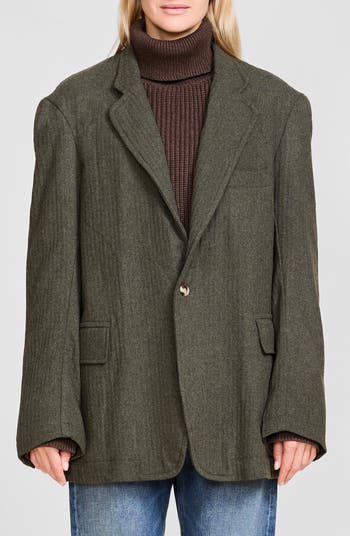 An oversized fit amplifies the contemporary attitude of this soft wool-blend blazer framed by notched lapels and flap pockets.