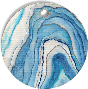 This round wooden cutting board features a matte side meant for cutting and a smooth satin side with an abstract watercolor pattern that is perfect for displaying.