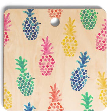 Colorful pineapples add a pop of tropical charm to this sleek birch wood cutting board.