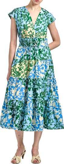 Crawling vines of bright flower blossoms make a pretty patchwork on this ruffle-tiered A-line dress cut from crisp cotton.