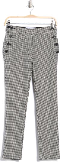 Sailor-style button plackets pass muster as decorative detailing for these high-waisted pants covered in a houndstooth print.