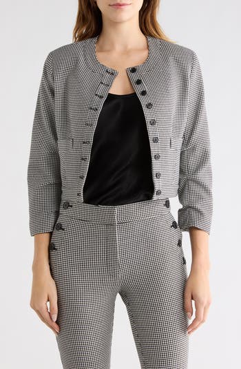 Refresh your work day essentials or polish up your weekend ensembles with this ruched-sleeve jacket covered in a houndstooth print.