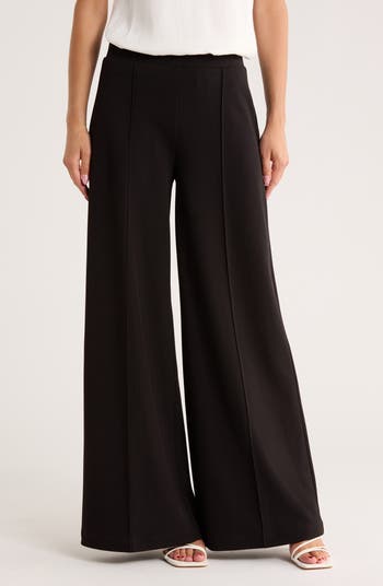 A wide-leg silhouette boosts the impact of these high-waisted pants cut from a stretchy knit for daylong comfort.