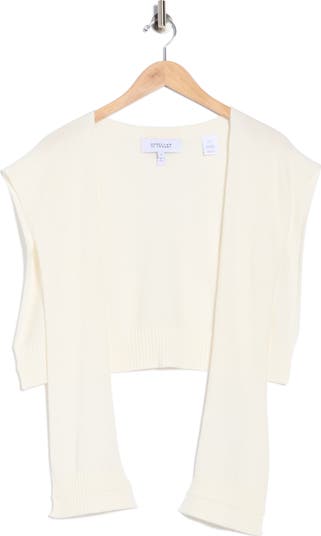 Creating a preppy, layered look minus the bulk is a breeze with this sweater-inspired shrug fashioned from soft cotton and wool.