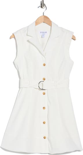 A notched collar and removable D-ring belt bring polished style to this sleeveless minidress cut from cotton-blend denim in a crisp A-line silhouette.