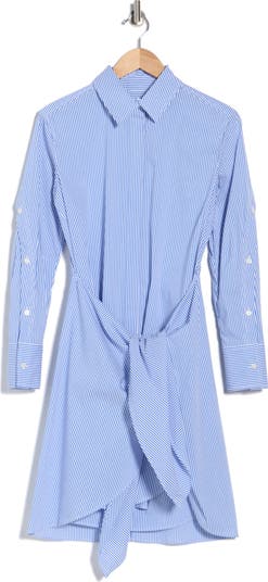 Button-up sleeves and attached tie-waist panels bring modern dimension to this perfectly polished shirtdress cut from a crisp cotton blend.