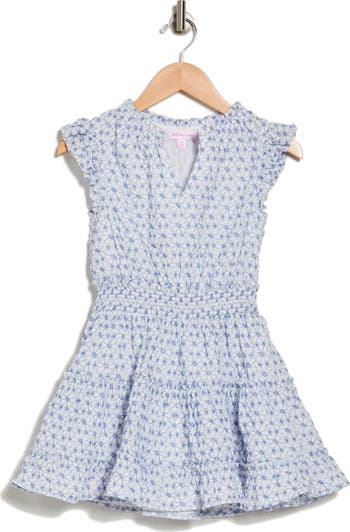 A floral eyelet design adds warm-weather charm to a kid-sized cotton dress fashioned with a smocked waist.