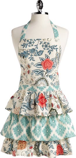 Exuberant mixed prints and ruffles charm a vintage-chic apron.