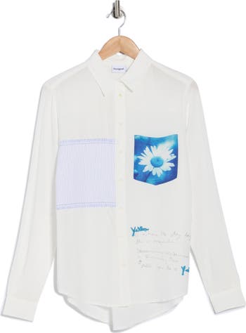 A journal-entry graphic, flower chest pocket and striped patch accent amp up the Y2K charm of this chic button-up shirt.