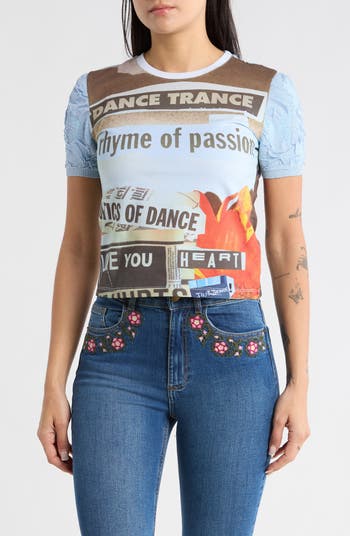 A magazine-cutout-inspired graphic creates an artful statement on this T-shirt finished with metallic-flecked knit short sleeves.