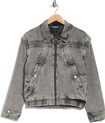 A faded acid wash brings '90s attitude to this sporty zip-front denim jacket framed by handy pockets and an elastic waist.