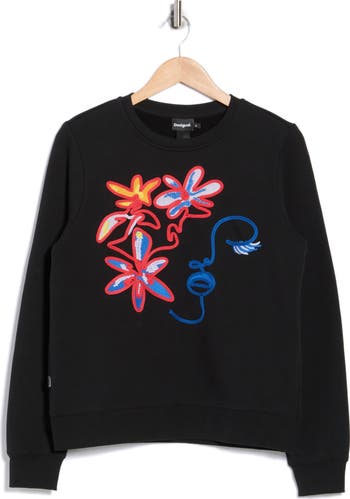An artsy embroidered floral design blossoms on this casual sweatshirt made from soft cotton.