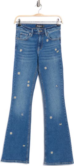Embroidered posies brings a touch of vintage inspiration to these perfectly faded jeans cut in a flare-leg silhouette.