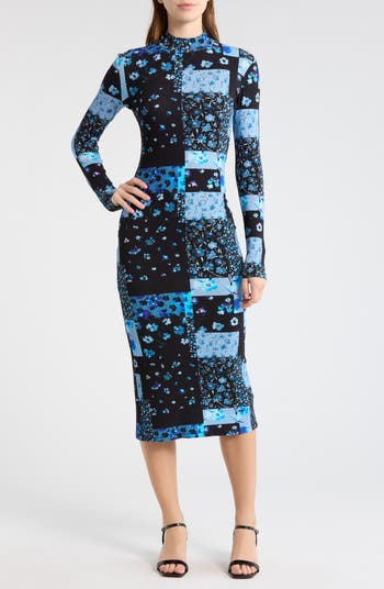 Patchwork floral prints boost the charm of this long-sleeve maxi dress cut from a soft ribbed knit.