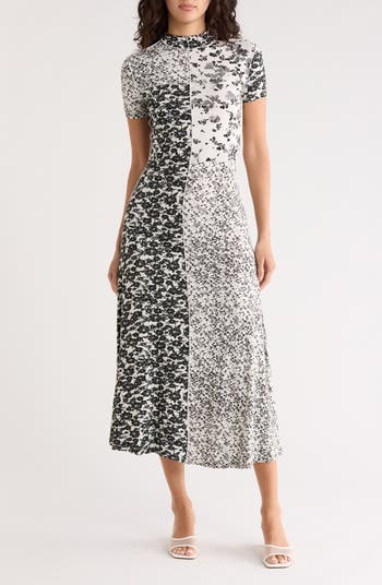 Black-and-white blooms in a patchwork design bring contemporary appeal to this knit dress styled with short sleeves.