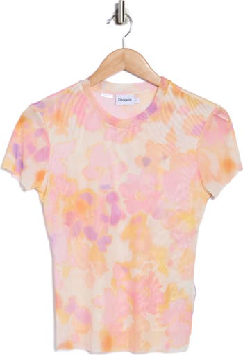 Faded blooms add to the warm romance of this stretchy mesh top framed with short sleeves.