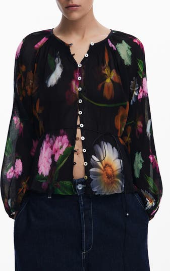 Fine allover pleats texture this blousy front-button top romanced by vivid watercolor blooms.