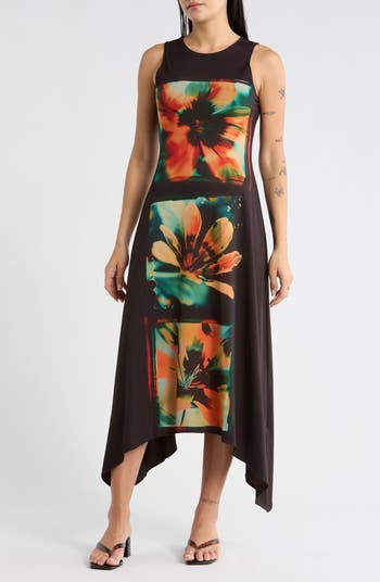 A trio of photorealistic blooms stamps the front of this flowy dress finished with a contemporary handkerchief hem.