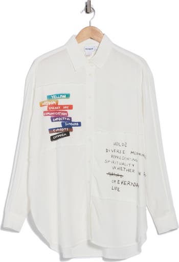 Workshop-inspired prints bring contemporary attitude to this lightweight button-up tunic shirt framed by dropped shoulders and a curved hem.