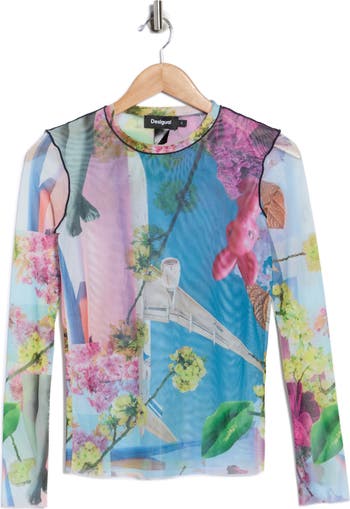 A vibrantly artful design adds to the Y2K appeal of this fun, flirty long-sleeve mesh top.