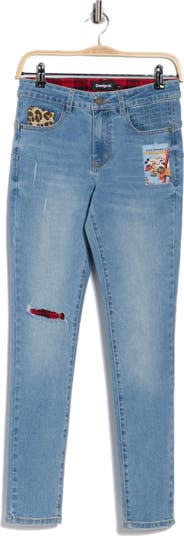 Mickey, Minnie and a variety of patchwork detailing bring eclectic style to skinny jeans crafted from stretch-enhanced cotton to make them an option for park days.