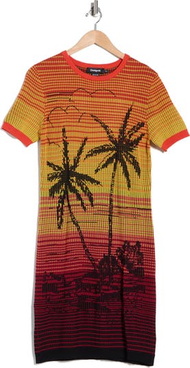 Perfect for your next casual outing or tropical vacation, this short-sleeved minidress covered with jacquard stripes and palm trees.