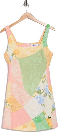 Brighten your day with this square-neck minidress fashioned with a patchwork print in cheery hues.
