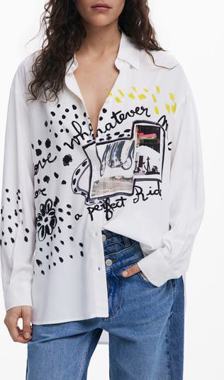 An artful abstract print emboldens a relaxed oversized shirt designed with a tuckable shirttail hem.