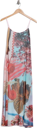 A vibrantly artful design adds to the Y2K appeal of this fun, flirty slip dress.