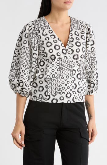 A classic black-and-white print distinguishes a woven top fashioned in a wrap silhouette to put your curves on display.