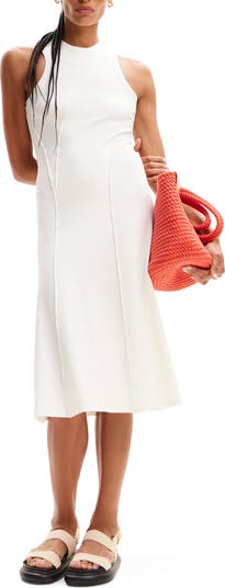 Multidirectional ribbed panels add touchable texture to this knit midi dress designed in a sleeveless silhouette with cutaway shoulders.