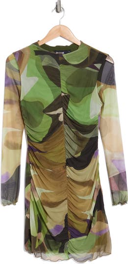 An abstract print boosts the chic style of this figure-hugging mesh minidress framed by sheer sleeves and front ruching.